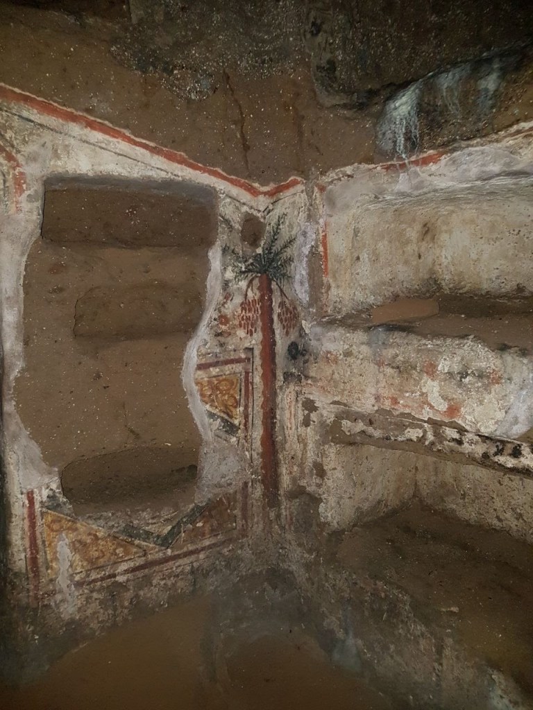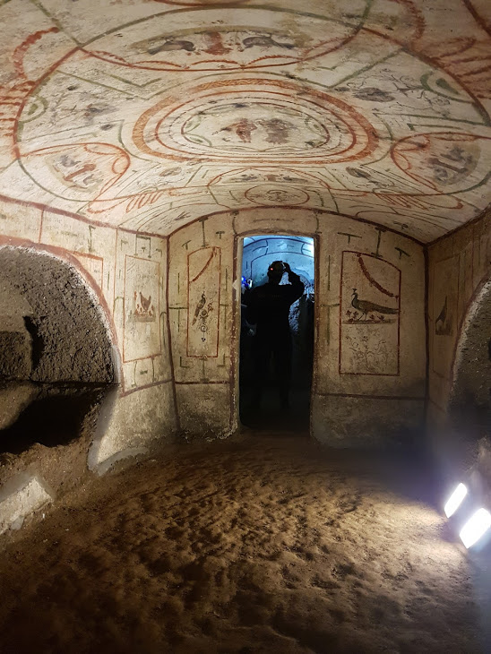 このカタコンベにはフレスコ画が施された埋葬室が3つあります。その中でも一番奥にある「ペガサスの埋葬室」には、孔雀やニワトリ、ハト、カモなどの鳥や、魚、植物、イルカ、花輪、プット、女神など、異教的なシンボルが一面に散りばめられており、圧巻です。