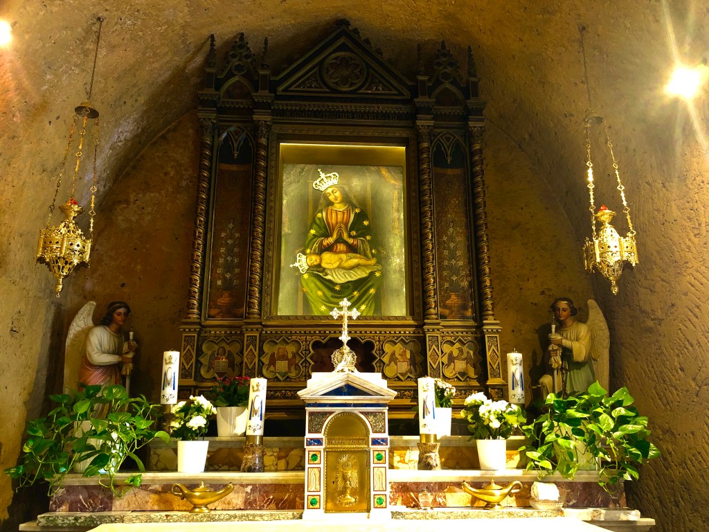 この聖母子像画が、いつ、どこで、誰によって描かれたのか、またいつからここに掲げられているのか、わかっていません。ただ、専門家たちは16世紀ごろに描かれたのではないかと推測しています。もともと洞窟の壁面にフレスコ画が施されていましたが、地中から水が滲み出て損傷してしまったので、現在の聖母子像画が掲げられたと考えられています。膝の上で寝ている幼子イエスを拝んでいる聖母像は、図像学的に珍しいものです。