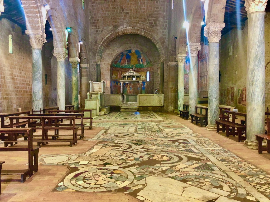 ローマ時代の建築物から再利用された柱が並ぶ内部は、ローマ周辺地域の中世教会建築の特徴であるコズマーティ様式の大理石モザイクが施された床が印象的です。祭壇に向かって左側の壁には、願い成就を感謝して奉納された聖母像や成人像のフレスコ画が並んでいます。