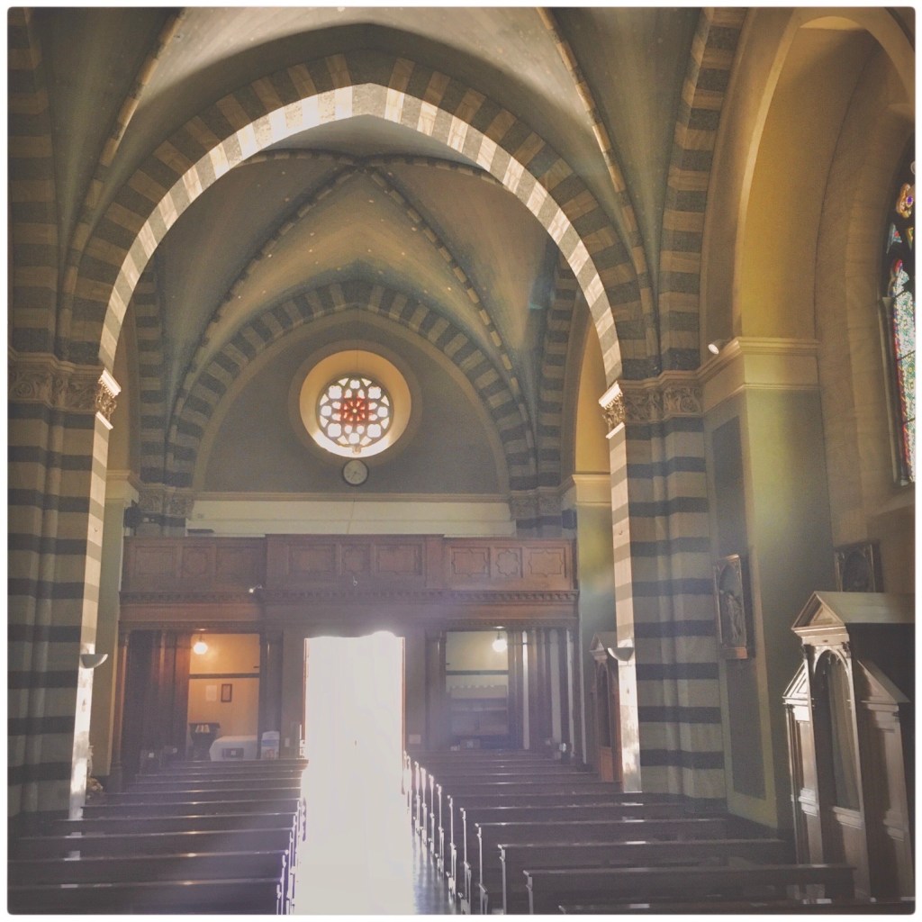 4種類の異なった4本の柱に支えられたバルダッキーノ(天蓋)の下にある祭壇上真ん中に大きくテンプル騎士団の十字架が描かれています。もしかしたら、テンプル騎士団との接触があるようなので、調べてみると意外な発見があるかもしれません。アプシスのフレスコ画は、11世紀に描かれたものです。上段は、キリストと聖ペトロ、聖エリア、聖エリセオ(?)、聖パオロ。下段は、二人の天使と殉教聖女たちが描かれています。ビザンチン様式によるフレスコ画で、聖女たちの煌びやかなファッションと、堂々とした天使たちの姿は必見です。