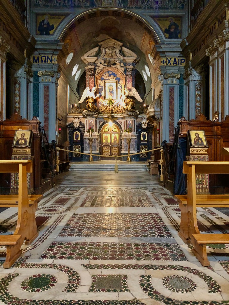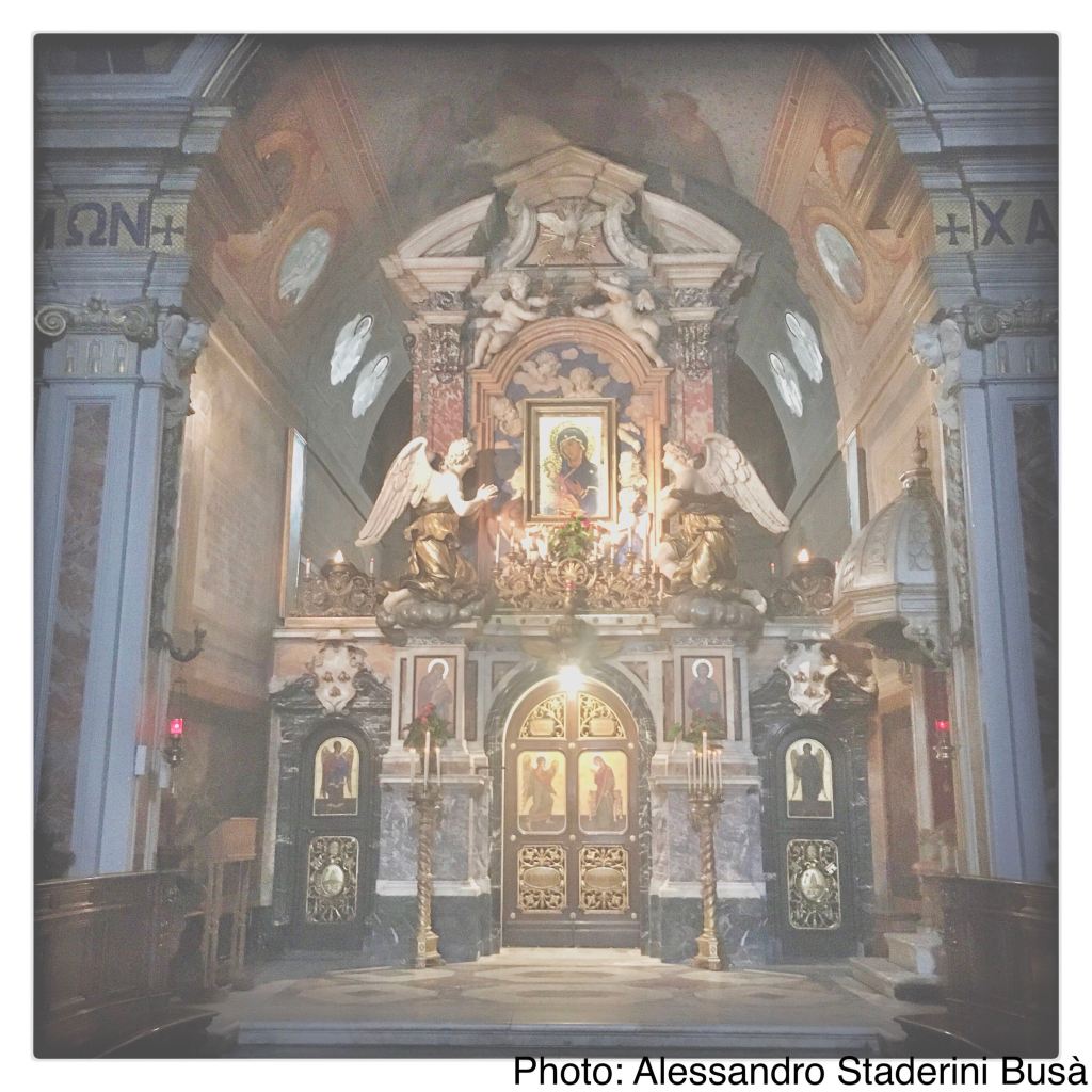 正教会の特徴である聖障は、ベルニーニが設計し、アントニオ・ジォルジエッティが彫刻を施しました(1669年)。大理石をふんだんに用いたとても豪華絢爛な作品です。ケルビムが支え、2体の天使像が拝んでいる古いビザンチン様式の聖母子像は、起源が不明ですが、大修道院の創設者たちがビザンチン帝国と深い関わりのあったカラブリア出身だったので、そのころの作品ではないかと考えられています。