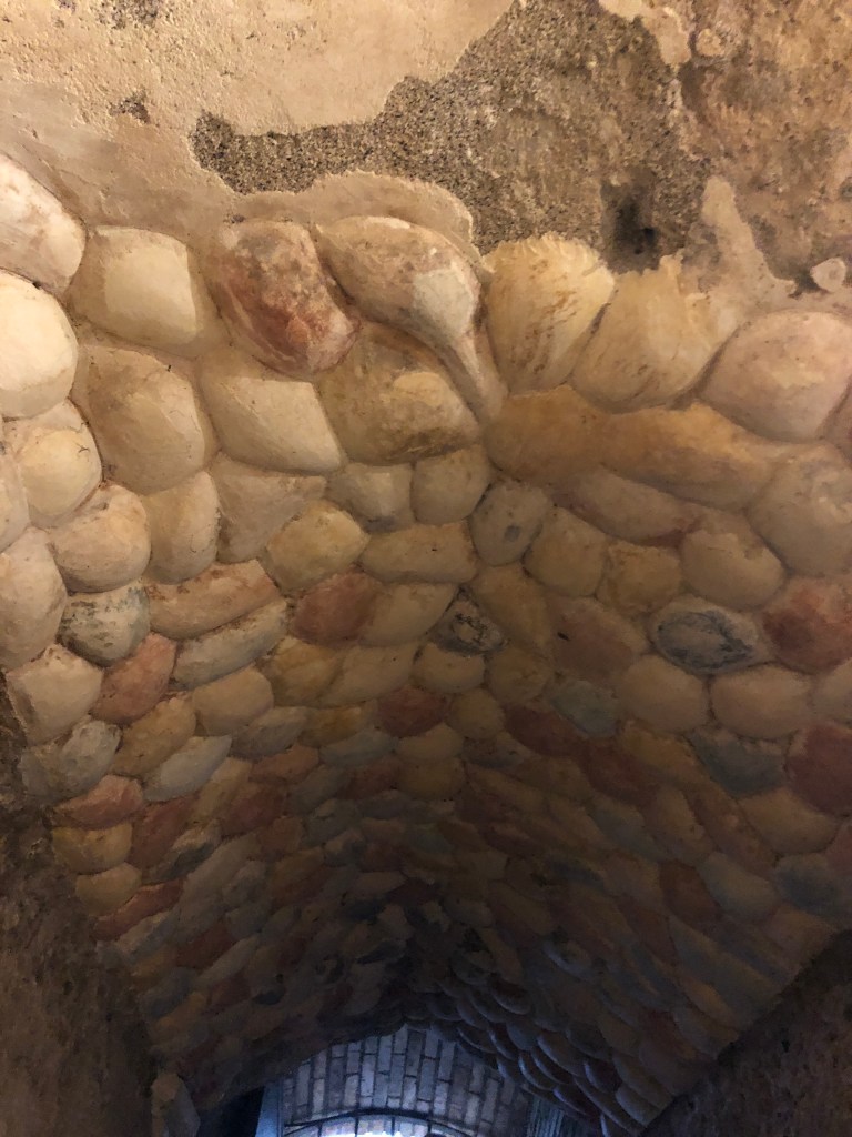 祭壇の後ろに、聖マリーナの礼拝堂があります。ここは、もともとローマ時代のニンフェウムでした。今でも当時の名残である筒形ヴォールトの格天井やニッチの貝モチーフなどを見ることができます。