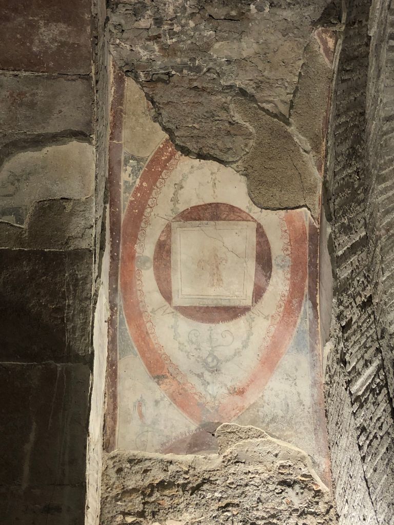 このローマ時代の部屋は、紀元前6世紀にローマ教皇シンマクスによって聖シルヴェストロに捧げる礼拝堂になりました。漆喰によってバロック様式の装飾が施された壁龕には、聖シルヴェストロと教皇シンマクスのモザイク画ありましたが、今はここにはありません。その代わり、17世紀、この礼拝堂をバロック様式の装飾を施した際に、壁龕の上に聖マリアと教皇シンマクスのモザイク画が設置されました。しかし、この聖母像をよく見てください。何か少し気持ち悪くないですか?実は、男性なんです!? もともとローマ教皇聖シルヴェストロでしたが、間違いか、それともわざとか、いつの間にか聖マリアに変身していたのです。3本指を立てて祝福する姿は、典型的なローマ教皇のしぐさです。